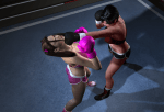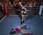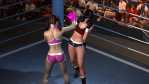 - OH NO!! Candy Carpenter buckles under the onslaught! She collapses to the mat, gripping her destroyed belly. Vanity stands nearby waiting to continue.