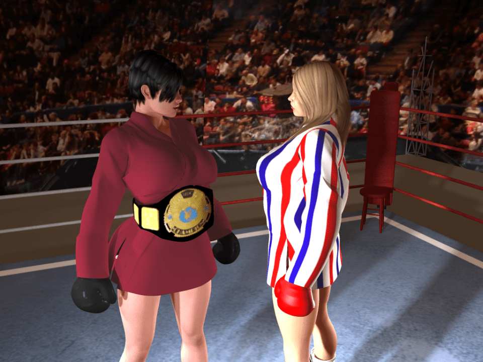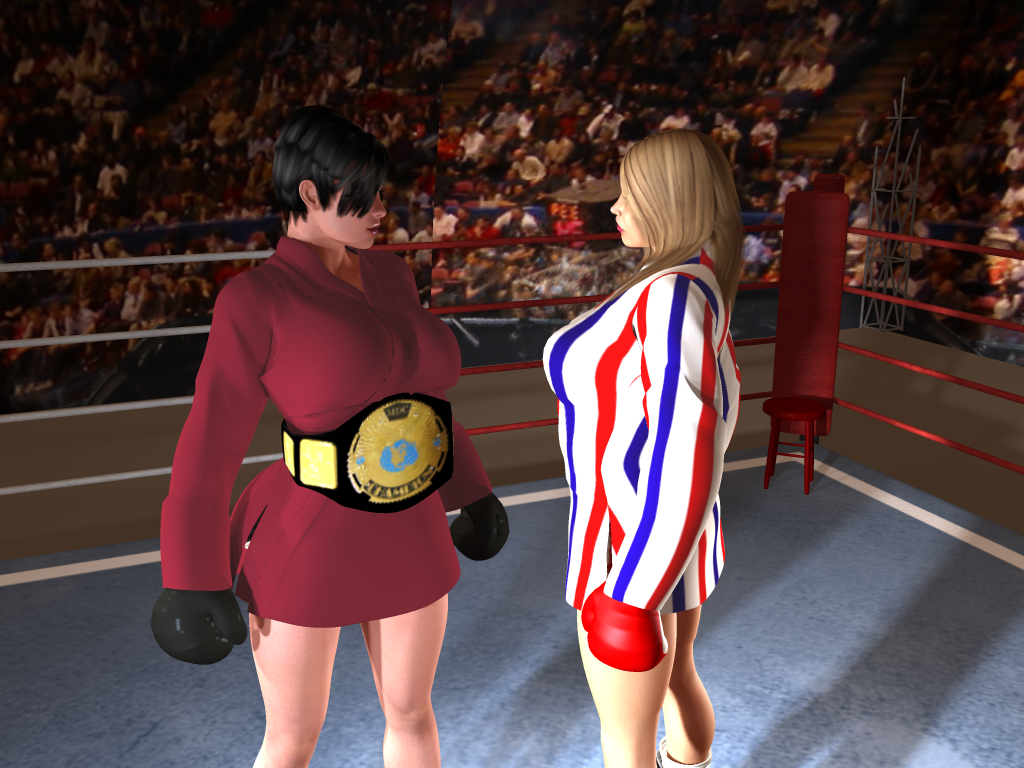 “LADIES AND GENTLEMEN, IN OUR NEXT BOUT, A ONCE-CHAMPION EARNS ANOTHER CHANCE AT GAINING HER BELT BACK!” Before being announced, both women jump into the ring, robes still on (to cover their half-naked bodies), and meet up face-to-face. The tension is high as they stare each other down.