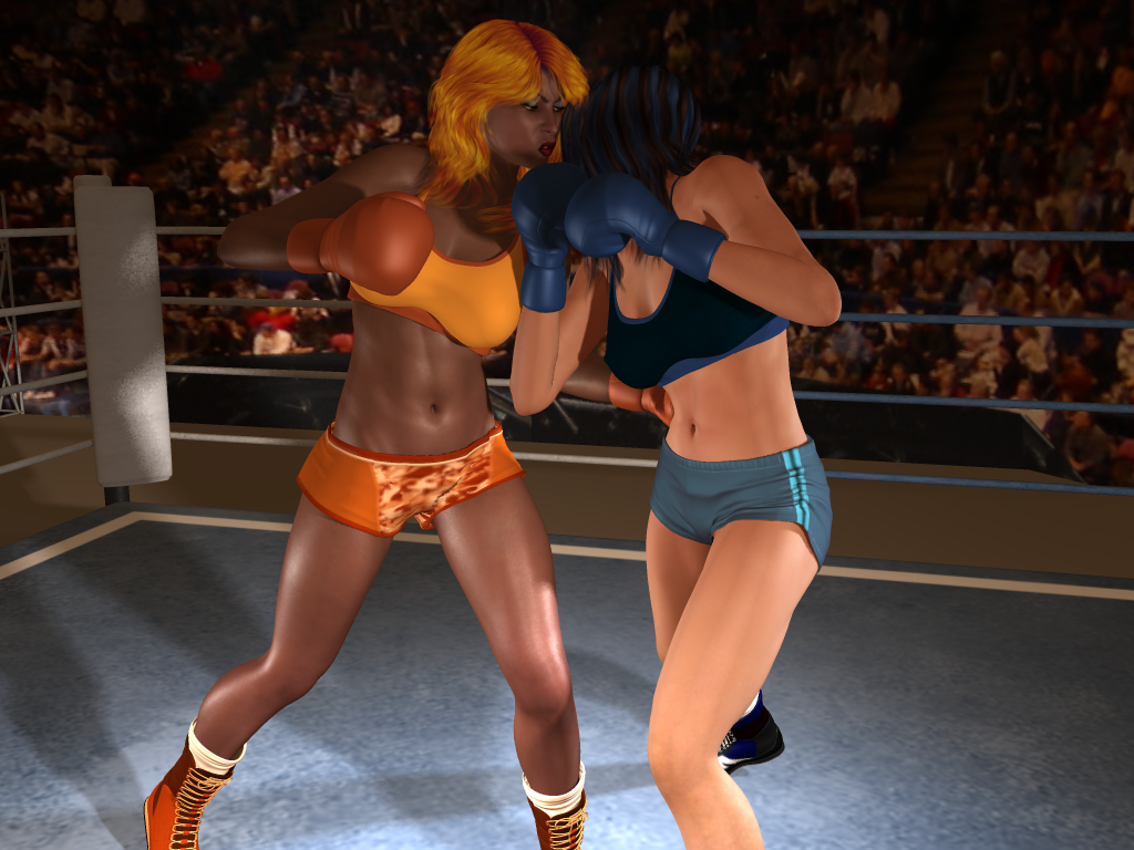 DING! And the first round begins! Pepper Synn gets serious and rushes into Ivanna, piercing her with body shots. Ivanna take the brunt of the blows and tries blocking others, but Pepper is no pushover. She stays in close to Ivanna, not giving her an opportunity to fight back.