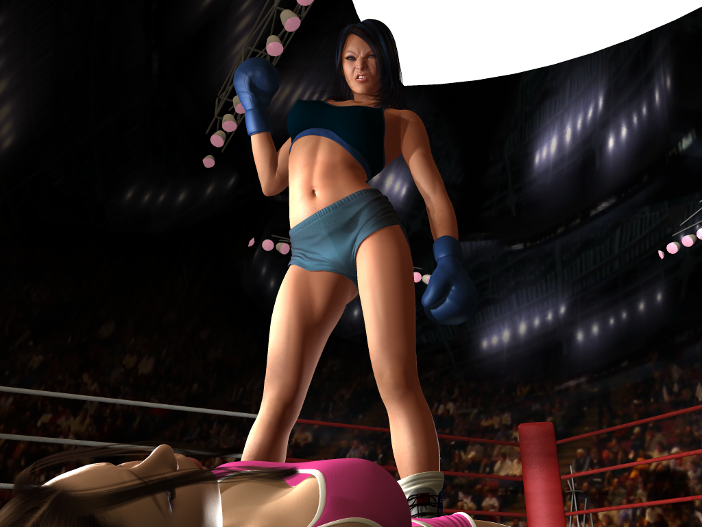 Ivanna looks down at Candy Carpenter. She listens as she is counted out. SEVEN… EIGHT… NINE… TEN! DING! DING! “THE WINNER OF THIS MATCH, BY FIRST-ROUND KNOCKOUT, IVANNA PAYNE!!” Ivanna can’t take it anymore. She’s beaten every women thrown at her, with ease. “No one here is worth my time! Your women are weak!” She hovers over Candy and finally, her anger gets the best of her…