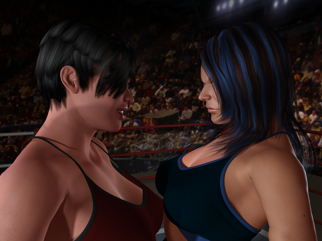 The crowd is electric tonight! After Ivanna Payne’s complete dismantling and destruction of ex-champion, Liberty Lane, she was finally granted a championship match against Vanity Vale. Before the fighters could even be announced, they met up in the center of the ring, mad-dogging each other with cocky and vicious stares.