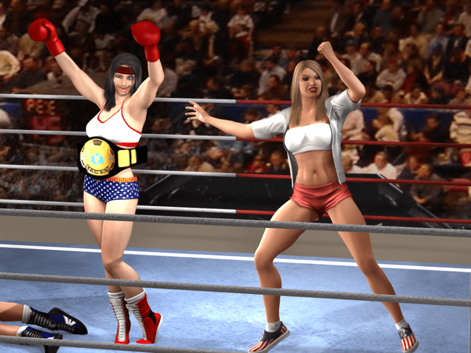 “Ladies and gentlemen… the winner of this bout, by knockout in the 3rd round… and NEW Foxy Boxing Champion of the World… RAQUEL BALBOA!!” Liberty Lane jumps into the ring to hand her the belt and congratulate her protege. She is ecstatic with the win! Raquel thanks her as Liberty places the belt around her waist.