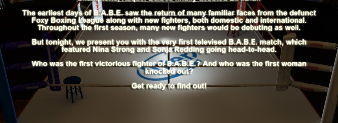 - “And her opponent tonight… from Baltimore, MD… please give a large welcome for Nina Strong!!” The crowd offered up equal parts cheers and equal parts boos. Nina had taken on a more aggressive personality toward the end of the old Foxy Boxing League. Now, she was in B.A.B.E. with the goal of becoming the greatest fighter around.