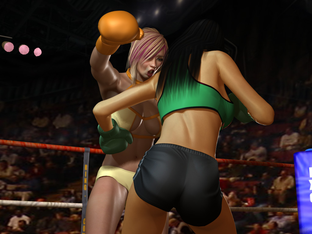 WHOA! In the blink of an eye, both fighters swung, but only one fighter connected! Lana aimed for Jade’s head and reached in with a right fist, but caught air! The Jade Fist leaned in, narrowly avoiding Lana’s punch, and slung her heavy left glove into Lana’s side, knocking the air from her lungs!