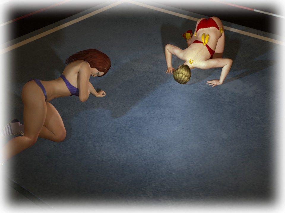 “Ladies and gentlemen, this has been an exhausting match-up for both combatants! The champion, Nikita Drago, and her challenger, Tina Corretti, have given it their all during this match and now both fighters are on the mat struggling to make it to their feet. Who will be the first to stand?”