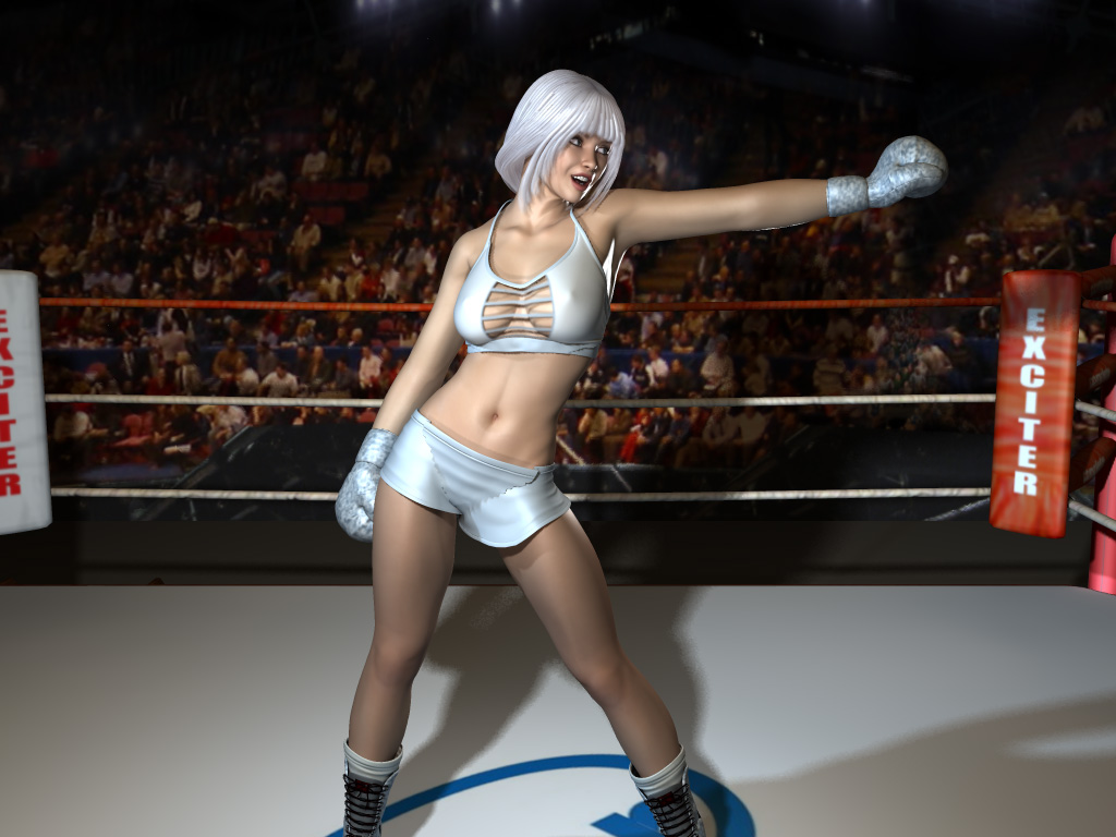 “Ladies and gentlemen… get ready for our next B.A.B.E. match-up tonight! First, fighting out of the blue corner, hailing from Toronto Canada, weighing in at 125 pounds… please welcome… SYLVIA SILVER!” The crowd cheered the pretty boxerette on as she reached out to the fans. Throughout her B.A.B.E. tenure, she had become a favorite with the fans, adding energetic spunk to the ring.