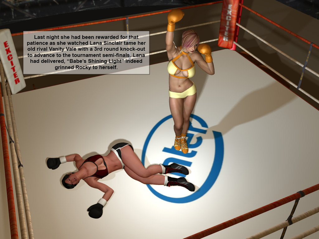 Rocky Balboa leaned back and swiveled in her leather executive chair, beaming with content. What a difference a week had made, and Rocky reflected on how grateful she was to have Liberty Lane’s sage advice still. After the double debacles of Penelope Primrose and Sonya Redding’s B.A.B.E tournament losses she had been frustrated, yet her longtime mentor had counseled patience. Last night she had been rewarded for that patience as she watched Lana Sinclair tame her old rival Vanity Vale with a 3rd round knock-out to advance to the tournament semi-finals. Lana had delivered, “Babe’s Shining Light” indeed grinned Rocky to herself.