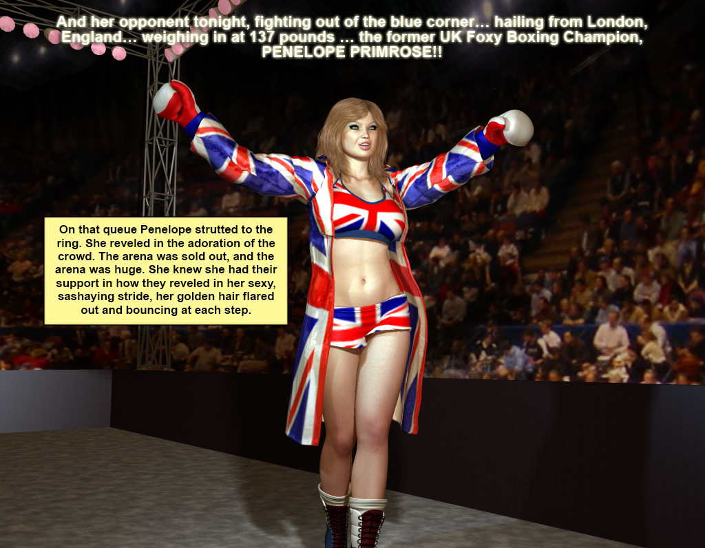 “. . . And her opponent tonight, fighting out of the blue corner… hailing from London, England… weighing in at 137 pounds … the former UK Foxy Boxing Champion, PENELOPE PRIMROSE!!”