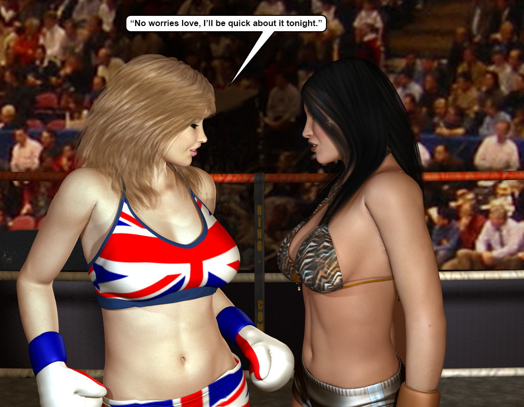 Rocky’s stinging critique of her last performance was on Penelope’s mind as she put on her Union Jack fighting gear. She knew she had some pressure tonight. She knew if she wanted that first shot at Jade she would have to overwhelm Hannah, hopefully in two rounds or less to better what Ashley had done against Hannah. That would show Rocky what she was made of. As she put on her robe she reflected on her recent quarrel with Missy Eddington, and feeling the hurt of how Missy herself had been critical of her performance on the airwaves of her home country. She felt betrayed, for Missy had always been her mentor and promoter. And though Missy had called again many times, Penelope felt determined to ignore those calls. She was on her own, and she would prove to them all that she was on top of her game. And as Penelope heard her music, she new it was time to fight.