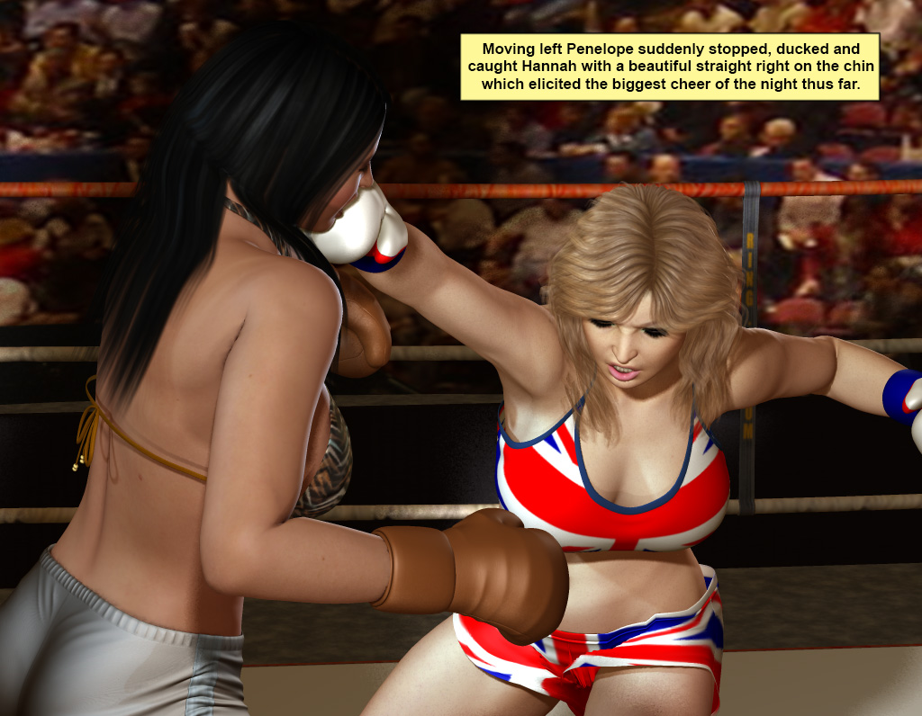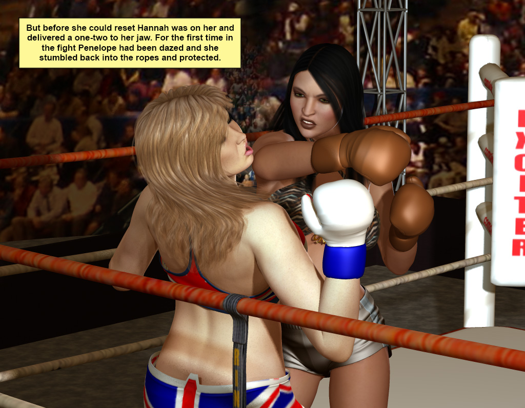 Penelope tried again to escape right but Hannah closed her off fast and anticipated Penelope’s back pedal. Penelope’s eyes widened as she saw Hannah pounce forward. Penelope fired off two jabs, but Hannah took them and moved on in catching Penelope with a straight right to her ample chest. Penelope was momentarily put off balance as her legs gave out and she stumbled clumsily backwards into the corner. Hannah had her were she wanted her.