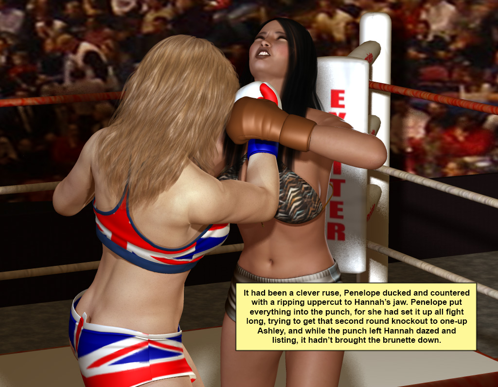 With the break by the referee, Penelope began moving around the ring again. Hannah had just had her best moment, and Penelope didn’t want to get caught in close again. Hannah continued to follow. She felt it was a matter of time before Penelope slowed down, and she had to be ready to strike when that happened. While Hannah was harping on what could happen in the future, Penelope brought her back to the present with a sharp left jab and another right hook that found it’s target on Hannah’s head. Another roar from the crowd and Hannah cursed herself for her loss of concentration. As much as Hannah tried to get inside, Penelope proved elusive and kept feeding left and right jabs to Hannah’s face. With seconds left in the round Penelope let her guard down and Hannah swung wildly. It had been a clever ruse, Penelope ducked and countered with a ripping uppercut to Hannah’s jaw. Penelope put everything into the punch, for she had set it up all fight long, trying to get that second round knockout to one-up Ashley, and while the punch left Hannah dazed and listing, it hadn’t brought the brunette down.