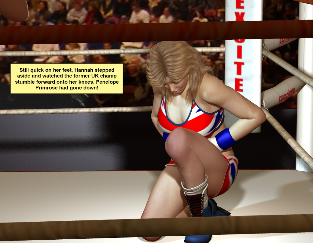 On that queue Penelope strutted to the ring. She reveled in the adoration of the crowd. The arena was sold out, and the arena was huge. She knew she had their support in how they reveled in her sexy, sashaying stride, her golden hair flared out and bouncing at each step. She gave the crowd an all-knowing smirk – she and they knew the beating she was about to put on poor Hurricane Hannah. She glared over at Hannah bouncing around in the red corner and winked, followed quickly by a pirouette and a wave to the crowd. She dropped her robe slowly, and relished the crowds excitement at seeing her familiar Union Jack fighting kit.