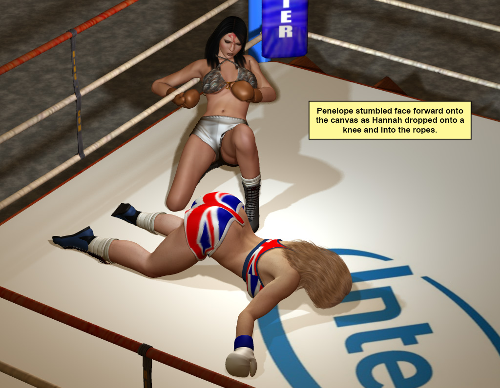 Penelope tried her best to straighten up after that last shot to her mid-section, but it was hard. She was hurting and was aware she was staggering somewhat to her corner. She resisted clutching her belly, though she wanted to. She couldn’t give Hannah that satisfaction.