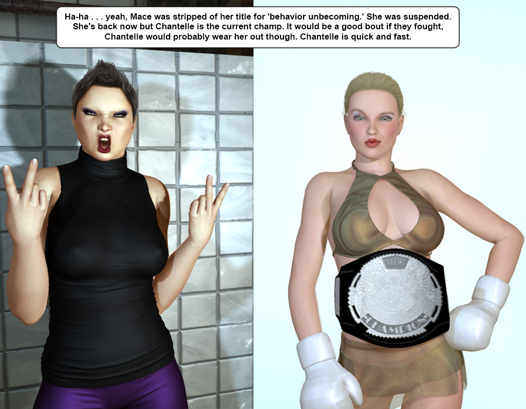“Ha-ha . . . yeah, Mace was stripped of her title for ‘behavior unbecoming.’ She was suspended. She’s back now but Chantelle is the current champ. It would be a good bout if they fought, Chantelle would probably wear her out though. Chantelle is quick and fast.