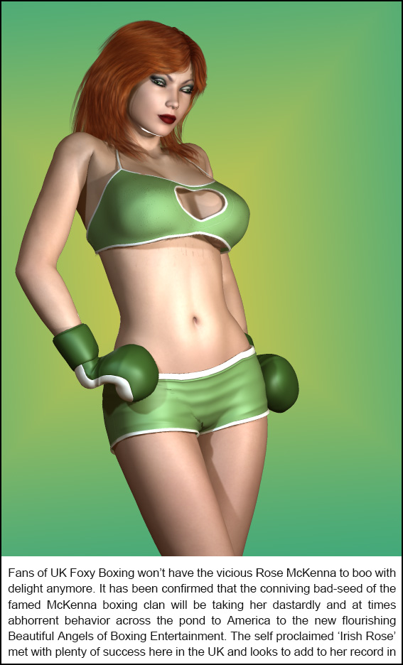 ‘ . . . Fans of UK Foxy Boxing won’t have the vicious Rose McKenna to boo with delight anymore. It has been confirmed that the conniving bad-seed of the famed McKenna boxing clan will be taking her dastardly and at times abhorrent behavior across the pond to America to the new flourishing Beautiful Angels of Boxing Entertainment. The self proclaimed ‘Irish Rose’ met with plenty of success here in the UK and looks to add to her record in this new league. For UK fans it puts on hold her budding rivalry with current champ Chantelle Daniels. B.A.B.E has landed talent from across the world, and many fighters see it now as the prime destination to prove their boxing bonafides. McKenna will be the second boxer to jump from the UK to B.A.B.E following the departure of former UK champion Penelope Primrose. McKenna may find a less formidable English rival in the former UK superstar Primrose than she had in Daniels. After a few wins early the supple Primrose has struggled against the upper echelon talent in B.A.B.E and has looked a shadow of her former championship form. McKenna hopes to meet with . . .’