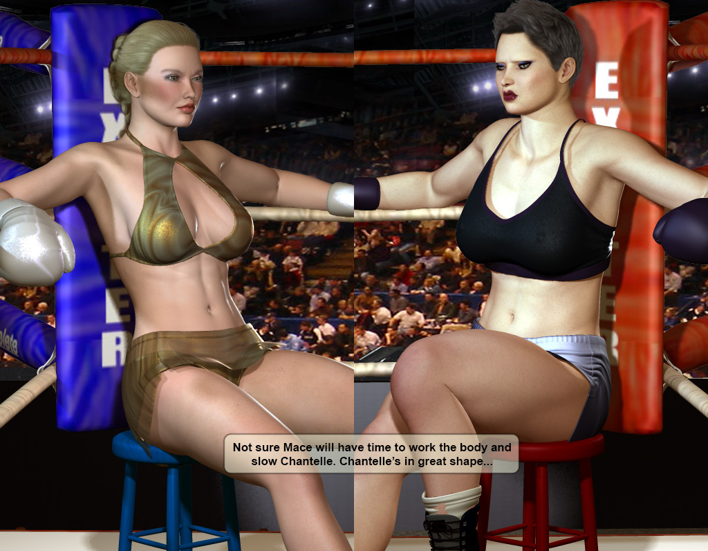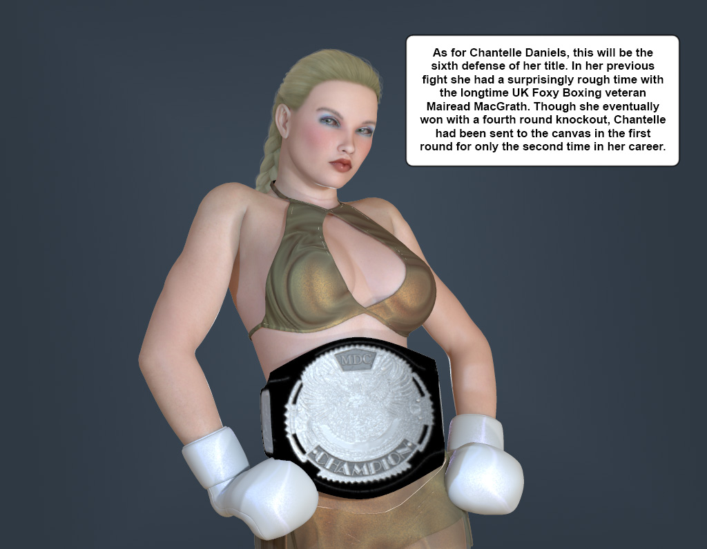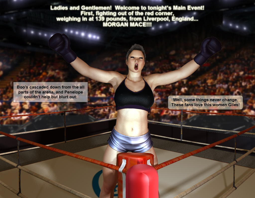 “Thanks David! Well folks, we have finally reached the Main Event! UK Foxy Boxing Champion Chantelle Daniels takes on former champion Morgan Mace, in what should be a titanic clash of vastly different styles. I am joined as always by Missy Eddington, and special guest commentator former champion Penelope Primrose. Welcome Penelope.