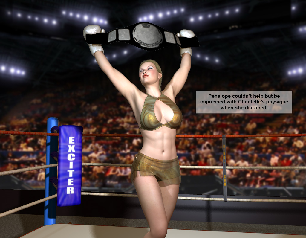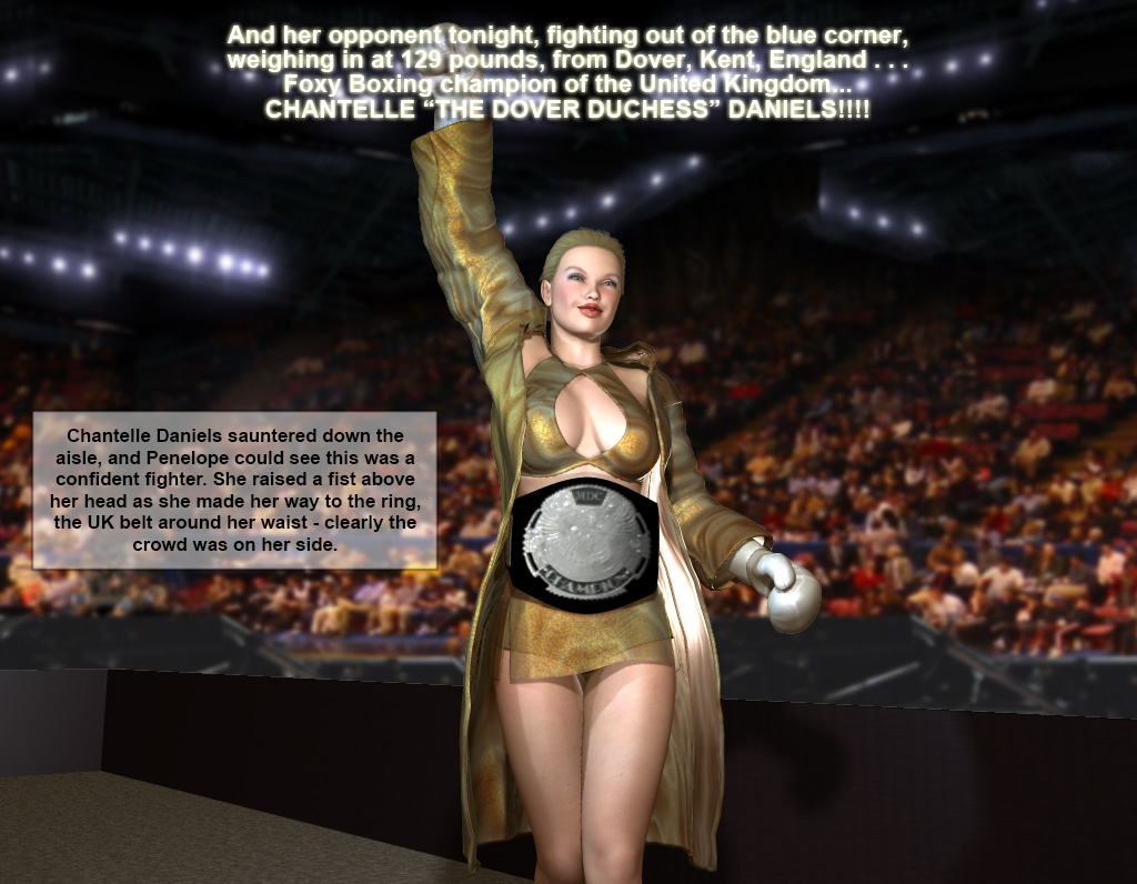 Before knocking off for the night Penelope sat on her bed watching the UK Foxy Boxing preview show for tomorrow night’s championship bout between Chantelle Daniels and Morgan Mace. Though she was very familiar with Mace from their long rivalry and previous two bouts, she felt the need to learn more about the current champion Chantelle. She’d nodded in and out of sleep throughout the program, two grueling workouts having sapped Penelope’s energy by 9 PM, but was intent on hearing the final thoughts of the renowned voice of UK Foxy Boxing David Kent.