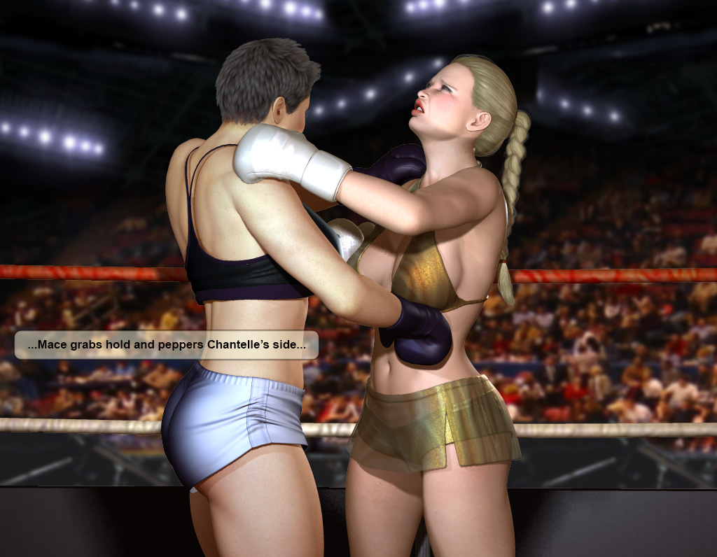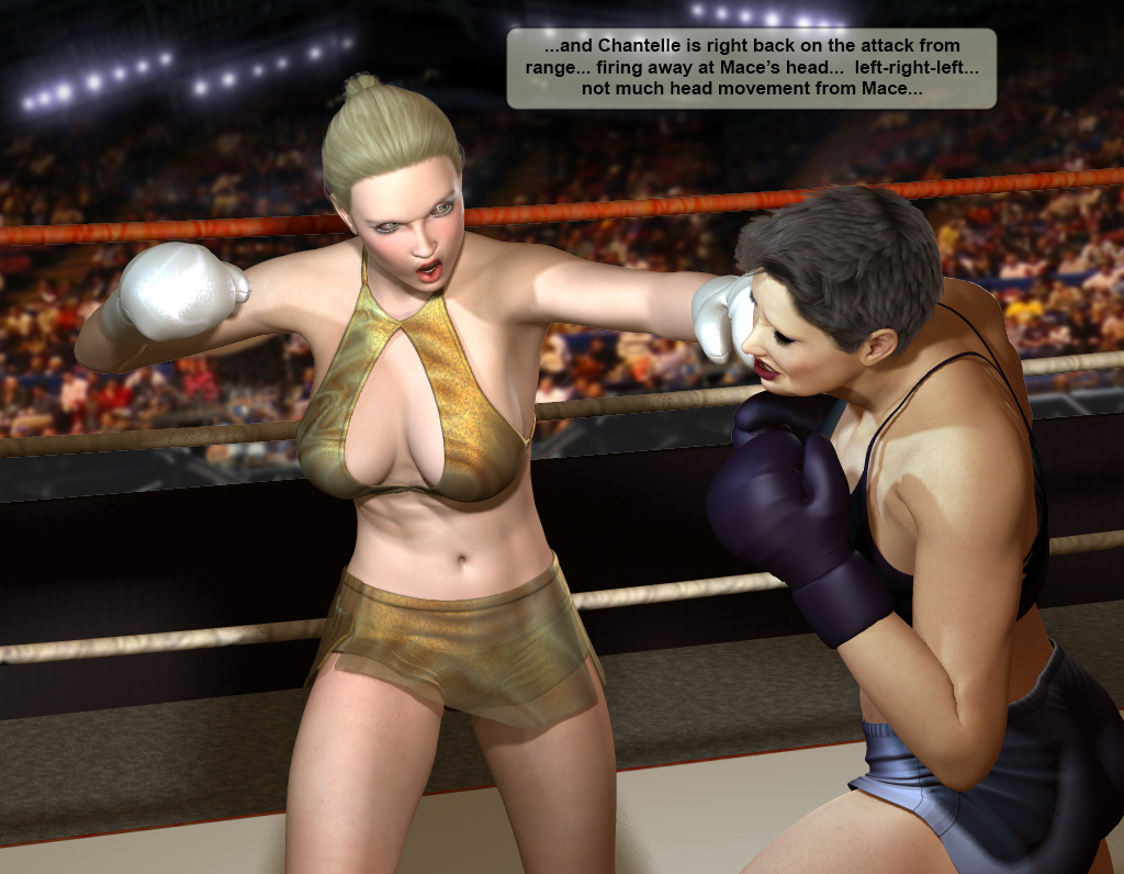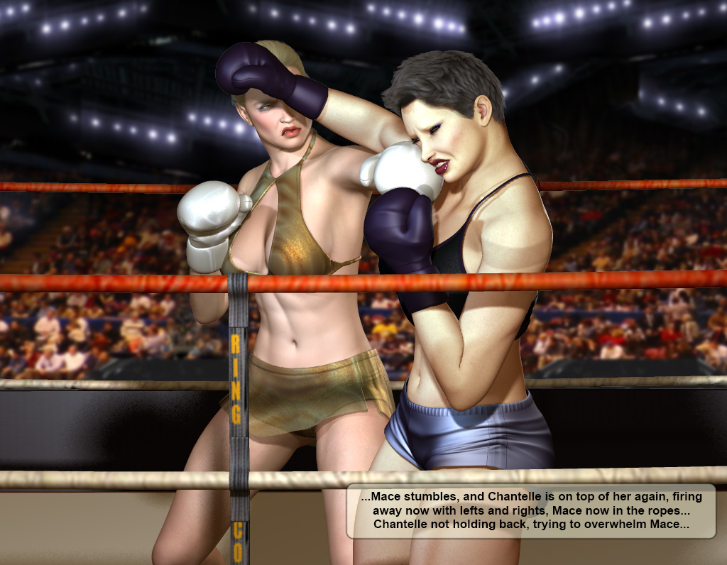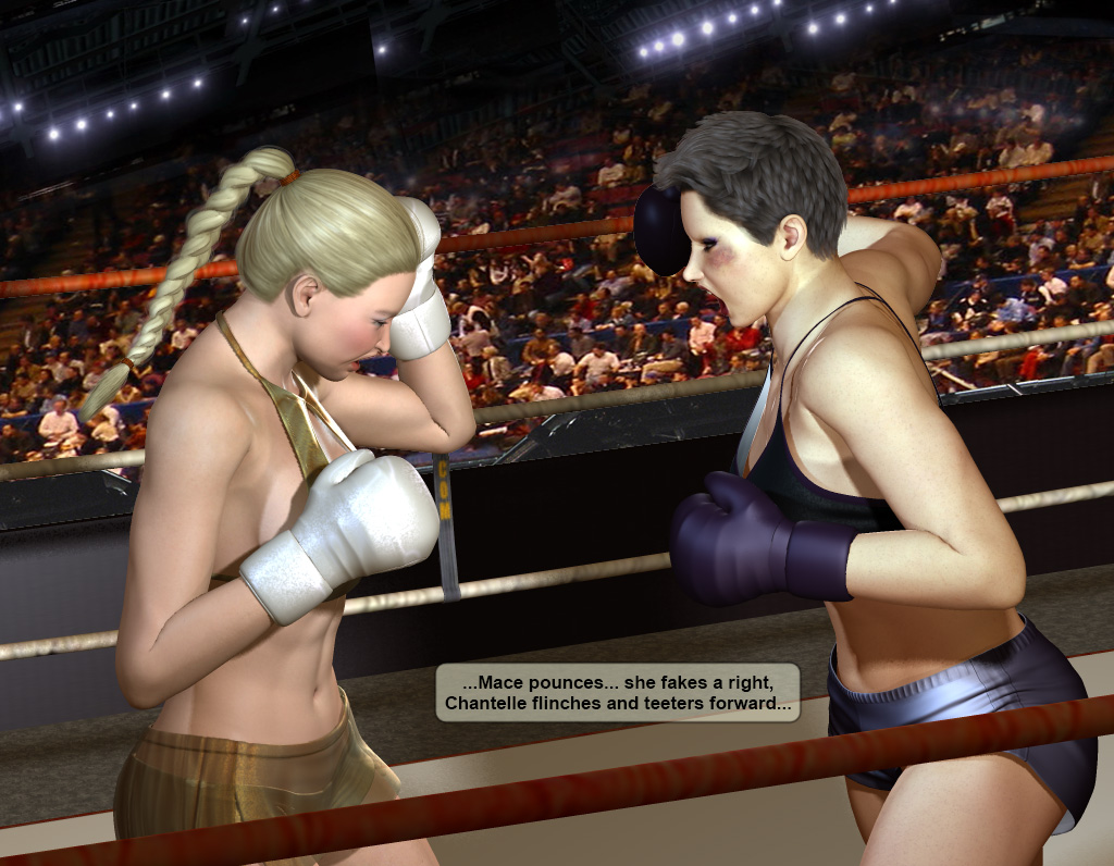 “The referee checks Chantelle . . . Chantelle still wobbling . . . Chantelle is nodding . . . but does she know what’s being asked? The fight is waved on! Chantelle needs all her savvy to survive this round . . . Mace pounces . . . she fakes a right, Chantelle flinches and teeters forward . . .