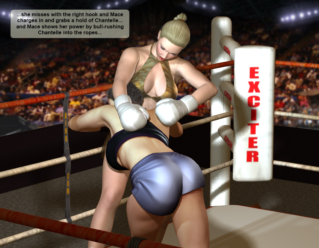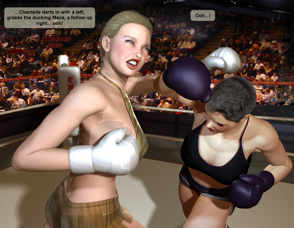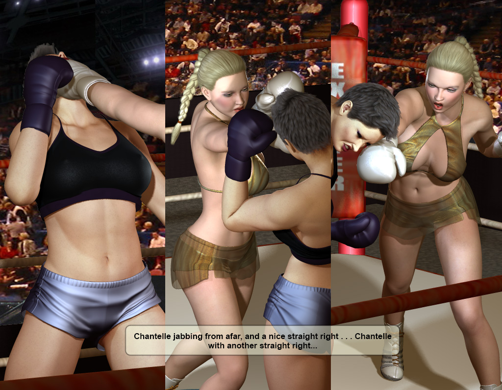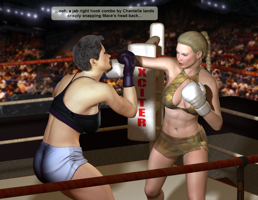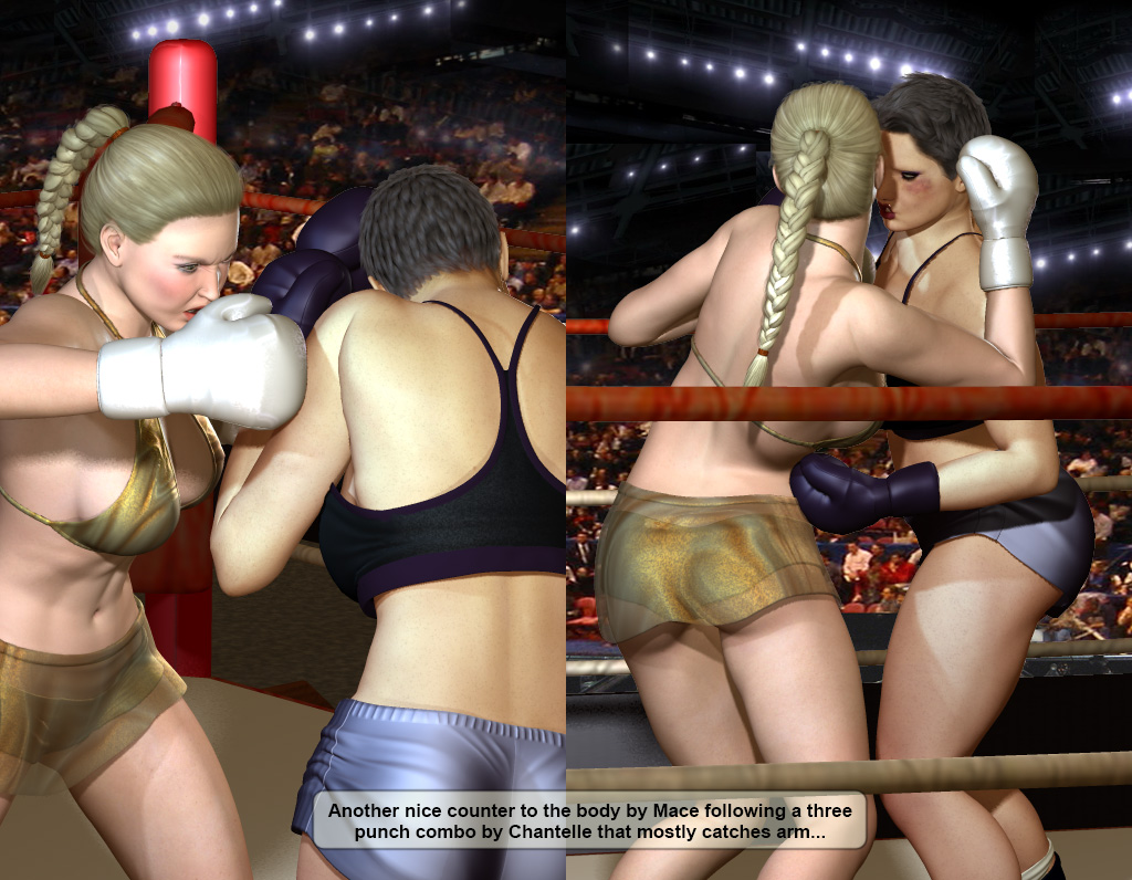 “The referee checks Chantelle . . . Chantelle still wobbling . . . Chantelle is nodding . . . but does she know what’s being asked? The fight is waved on! Chantelle needs all her savvy to survive this round . . . Mace pounces . . . she fakes a right, Chantelle flinches and teeters forward . . .