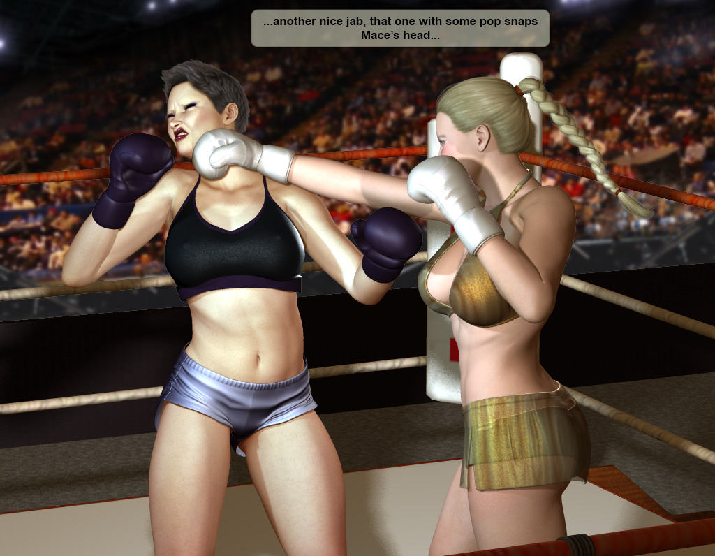 “And Missy, there is another nice jab combo by the champ . . . Mace resettles . . . ooh, a jab right hook combo by Chantelle lands crisply snapping Mace’s head back . . .