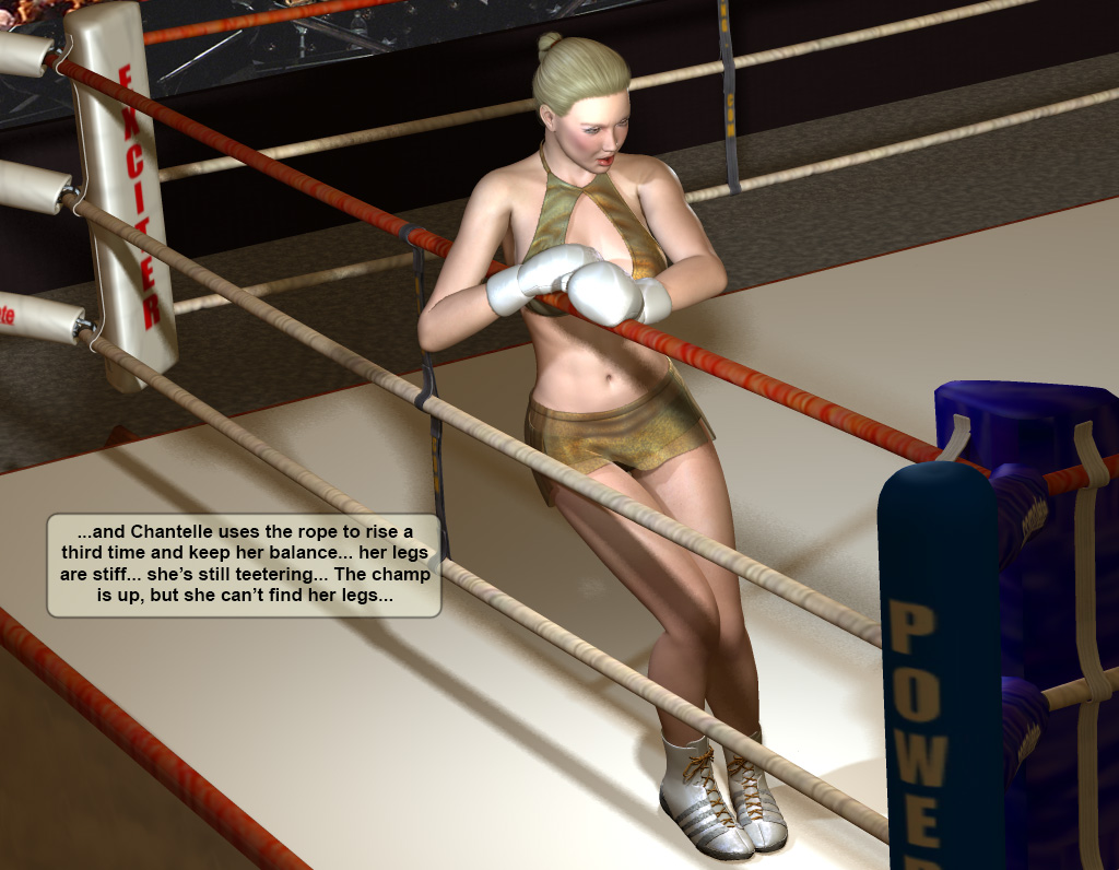“ . . . and Chantelle uses the rope to rise a third time and keep her balance . . . her legs are stiff . . . she’s still teetering . . . The champ is up, but she can’t find her legs . . . “