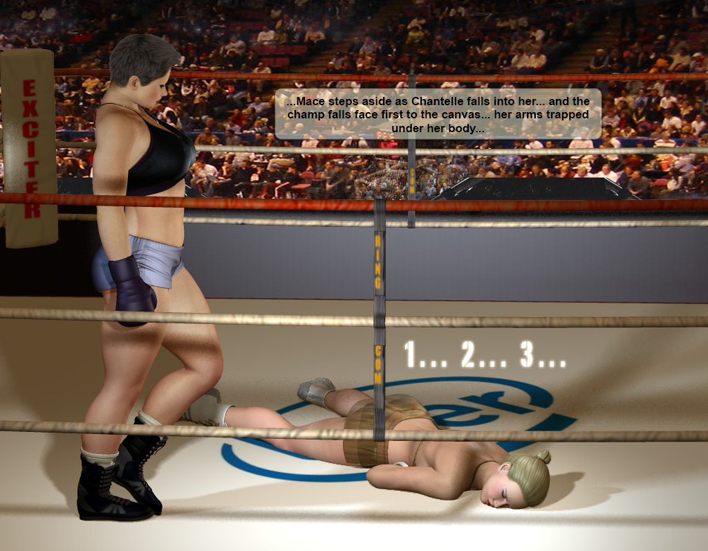 “. . .Mace steps aside as Chantelle falls into her . . . and the champ falls face first to the canvas . . . her arms trapped under her body . . .