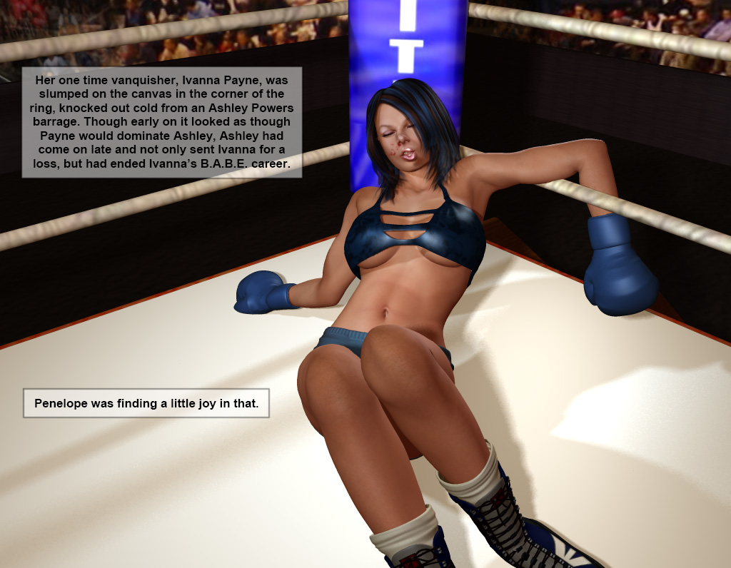 Despite her own ongoing issues with her fledgling career, Penelope Primrose had a reason to smile in the early morning hours in her London flat. Though a mere couple of hours from her next early morning training session with her new coach Missy Eddington, and still feeling the mental and physical wounds of her shocking knock out loss in her UK Foxy Boxing return, Penelope was smiling. Her giddiness was attributed to having just watched the woman who had exposed her weak and out-of-condition form to the boxing world getting knocked out in the final bout of B.A.B.E’s opening season. Her one time vanquisher, Ivanna Payne, was slumped on the canvas in the corner of the ring, knocked out cold from an Ashley Powers barrage. Though early on it looked as though Payne would dominate Ashley, Ashley had come on late and not only sent Ivanna for a loss, but had ended Ivanna’s B.A.B.E. career. Penelope was finding a little joy in that.