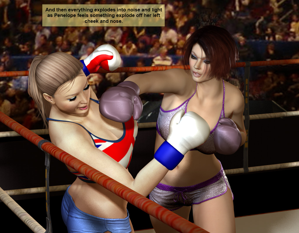 “Get off the ropes! Penelope fight!” She can sense a murmur in the crowd, and buzzing confusion. And then everything explodes into noise and light as Penelope feels something explode off her left cheek and nose.