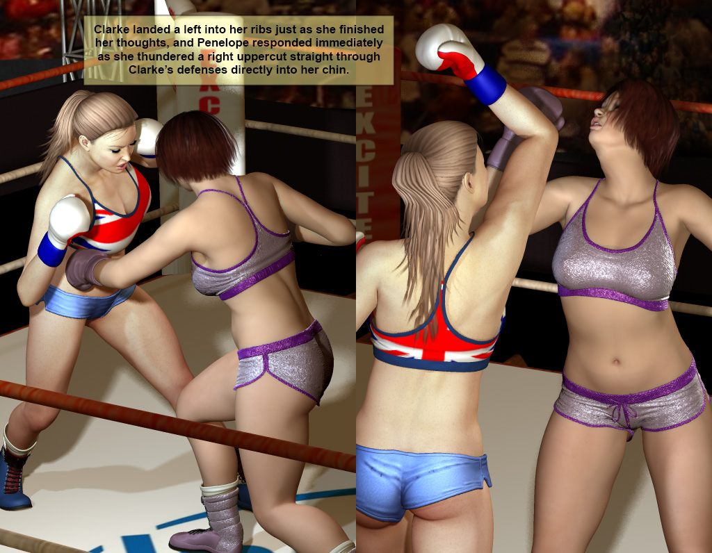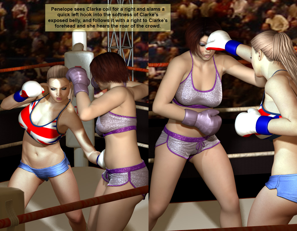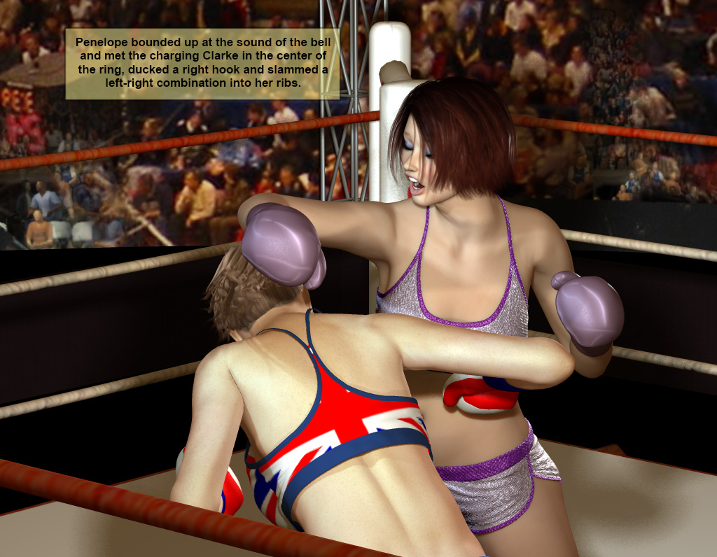 Penelope bounded up at the sound of the bell and met the charging Clarke in the center of the ring, ducked a right hook and slammed a left-right combination into her ribs.
