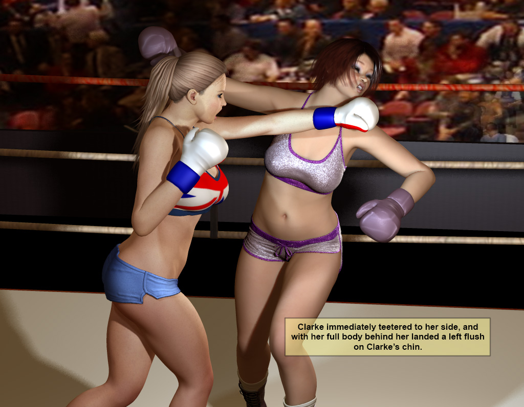 Clarke was quickly slowing down, no longer charging forward, merely shuffling side to side now and again. Clarke fired off a jab, and quickly Penelope retaliated with a left-right combo to Clarke’s midsection. She felt the air go out of Clarke’s yielding body, and fired off a jab to Clarke’s open mouth.