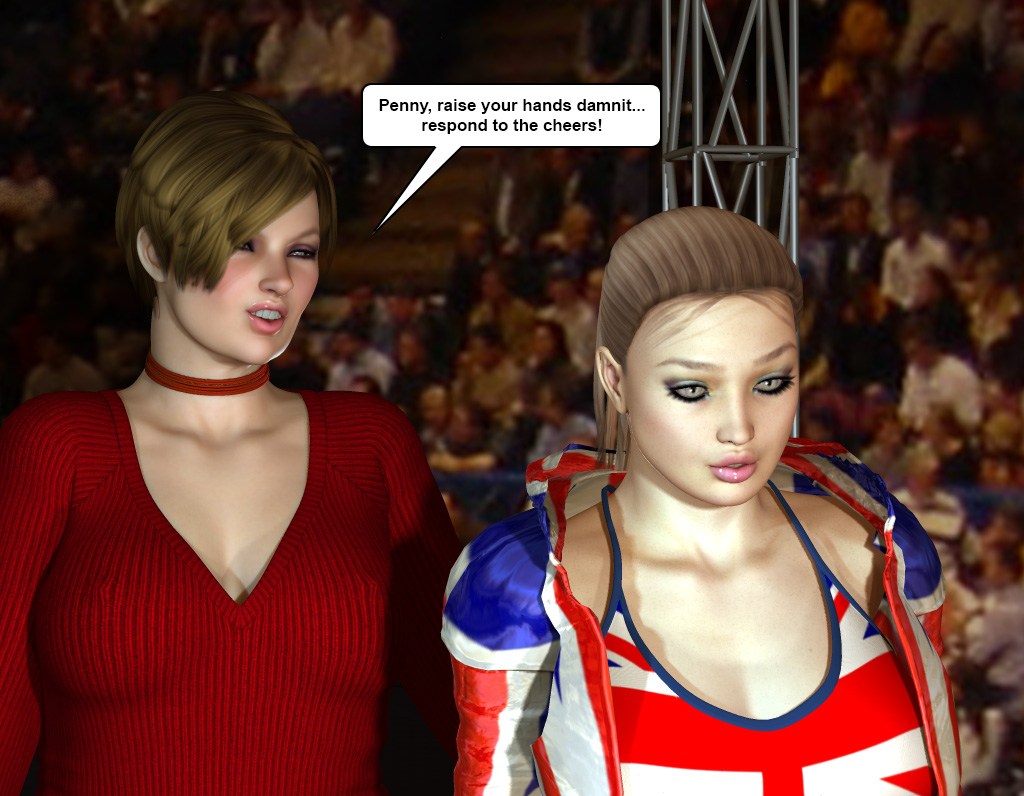 Penelope felt a hard smack on her rear end, “Penny, raise your hands damnit . . . respond to the cheers!”