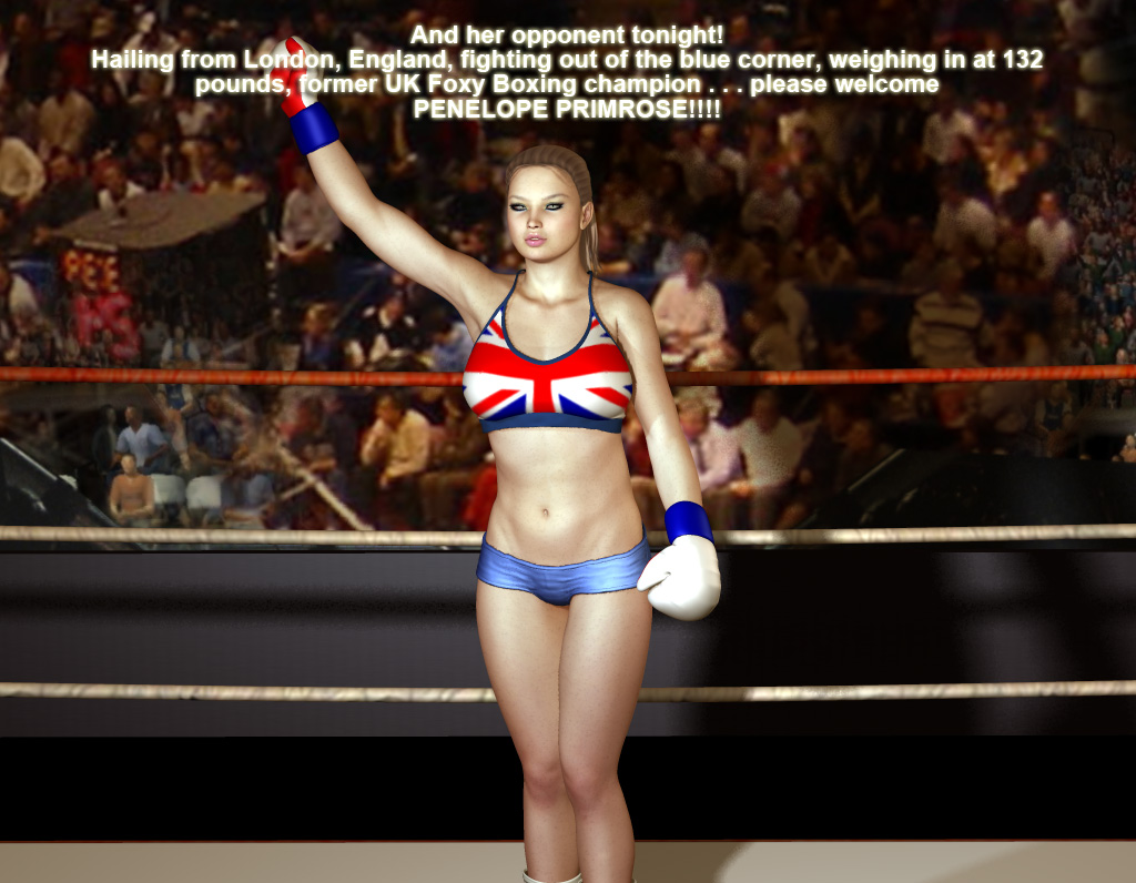 “And her opponent tonight! Hailing from London, England, fighting out of the blue corner, weighing in at 132 pounds, former UK Foxy Boxing champion . . . please welcome Penelope Primrose!!!!!”