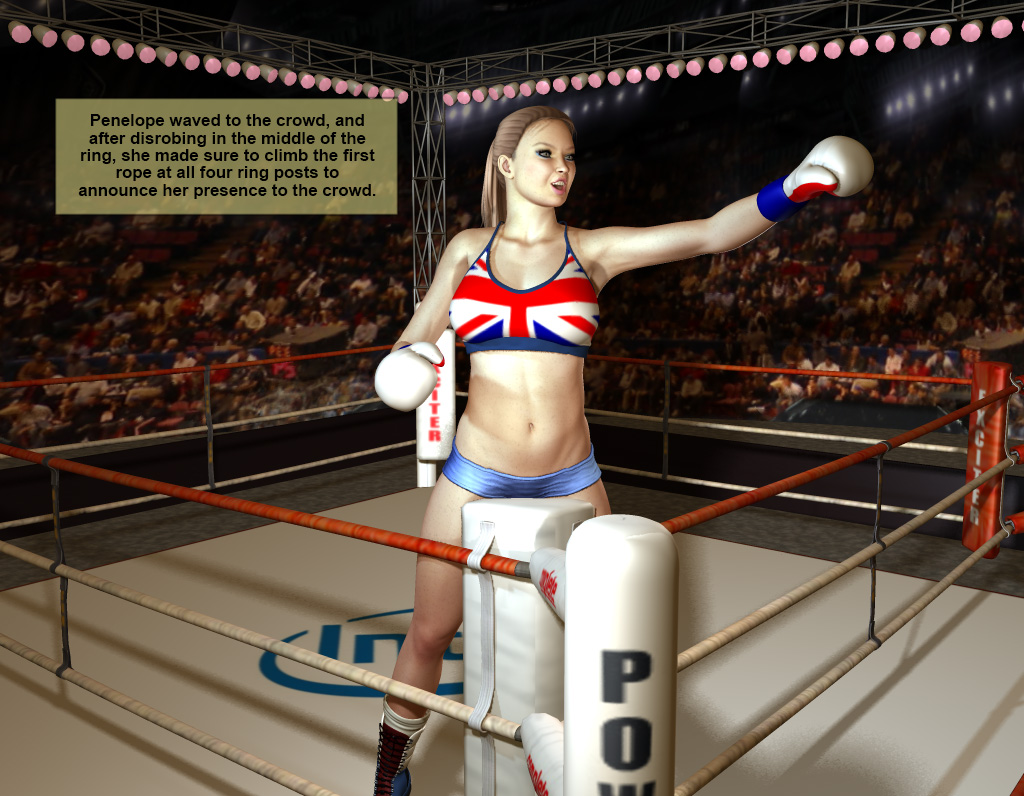 “Ladies and Gentlemen! Fighting out of the red corner, weighing in at 131 pounds and making her way from London, England – – – former UK Foxy Boxing Champion . . . Penelope Primrose!!!”