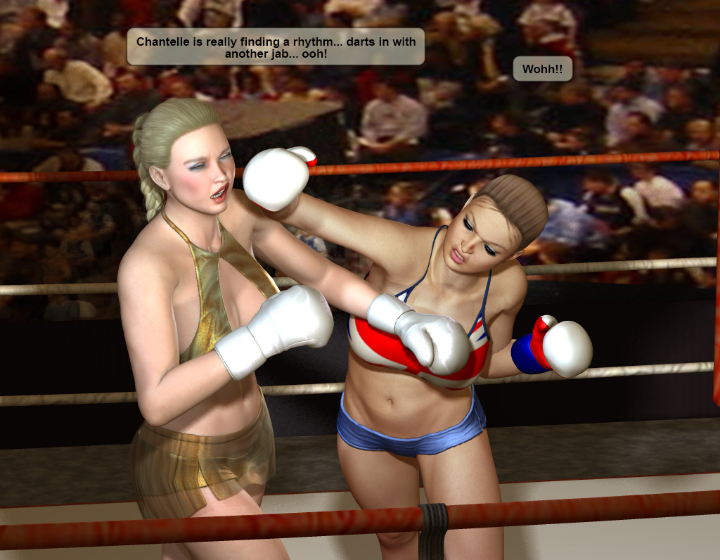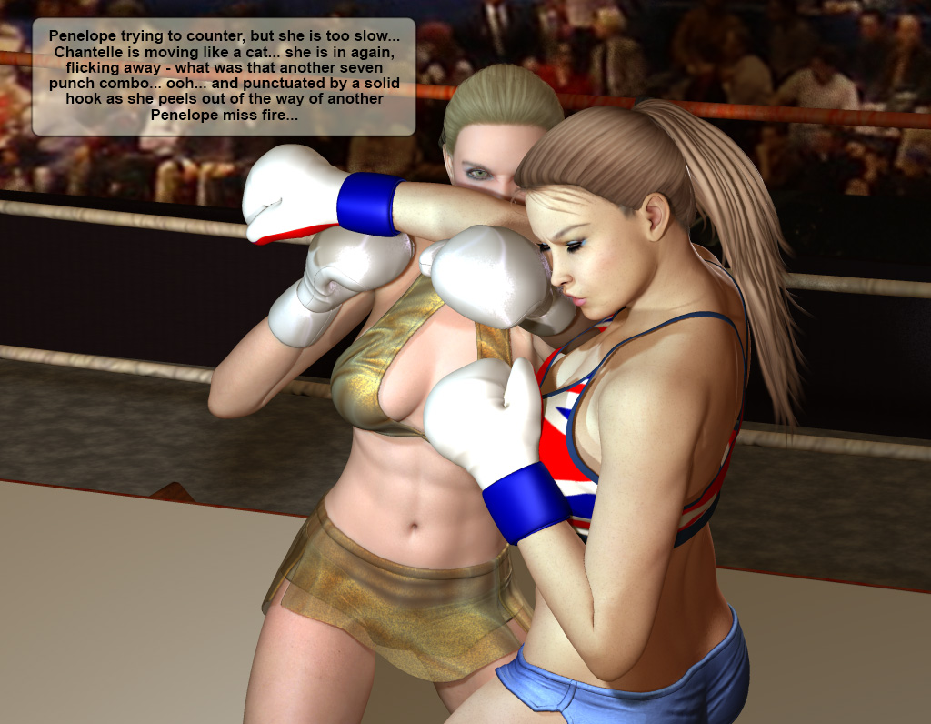 “Some testing jabs from Chantelle but not much affect . . . Penelope counters and misses as Chantelle tip toes away . . .Both fighters kind of stalking each other . . .”