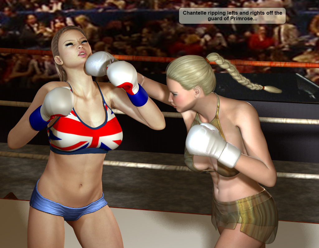 “Unbelievable . . . not how we saw this fight going . . . Chantelle Daniels is in real trouble! And Penelope Primrose is quieting a lot of doubters with this performance! She withstood some serious flurries from Chantelle in Rounds two and three . . . but she has turned this fight around big time Giles!”