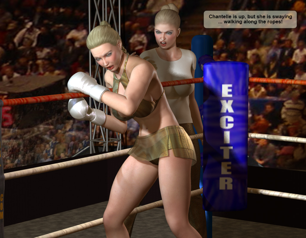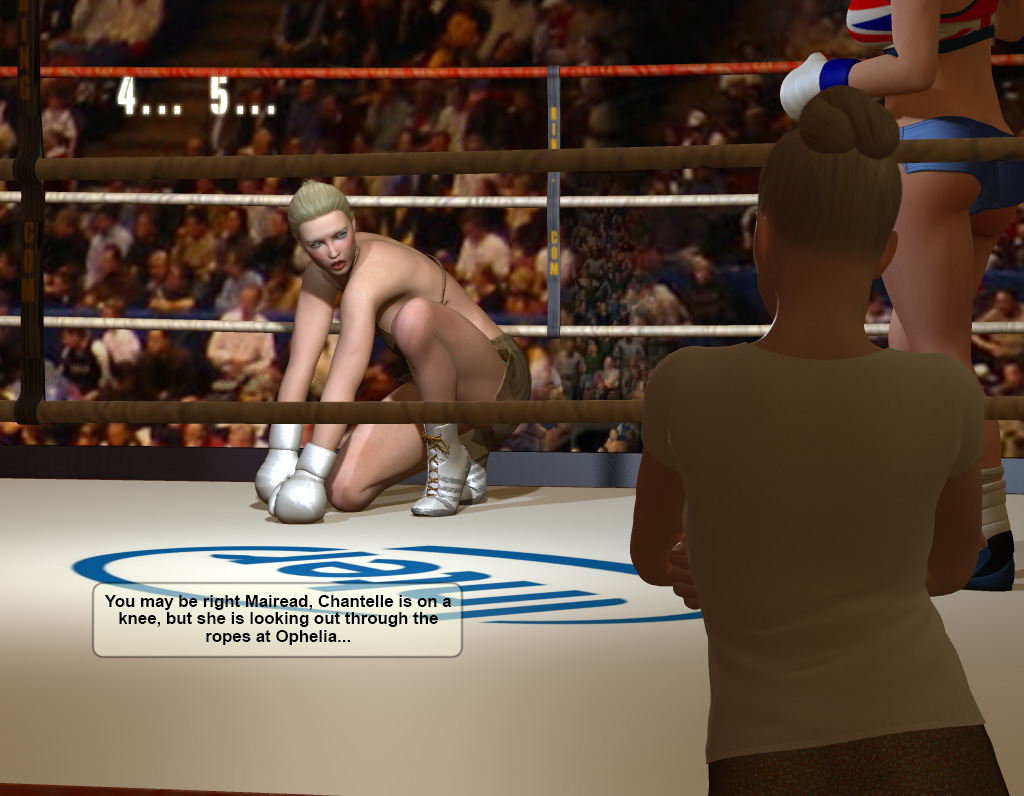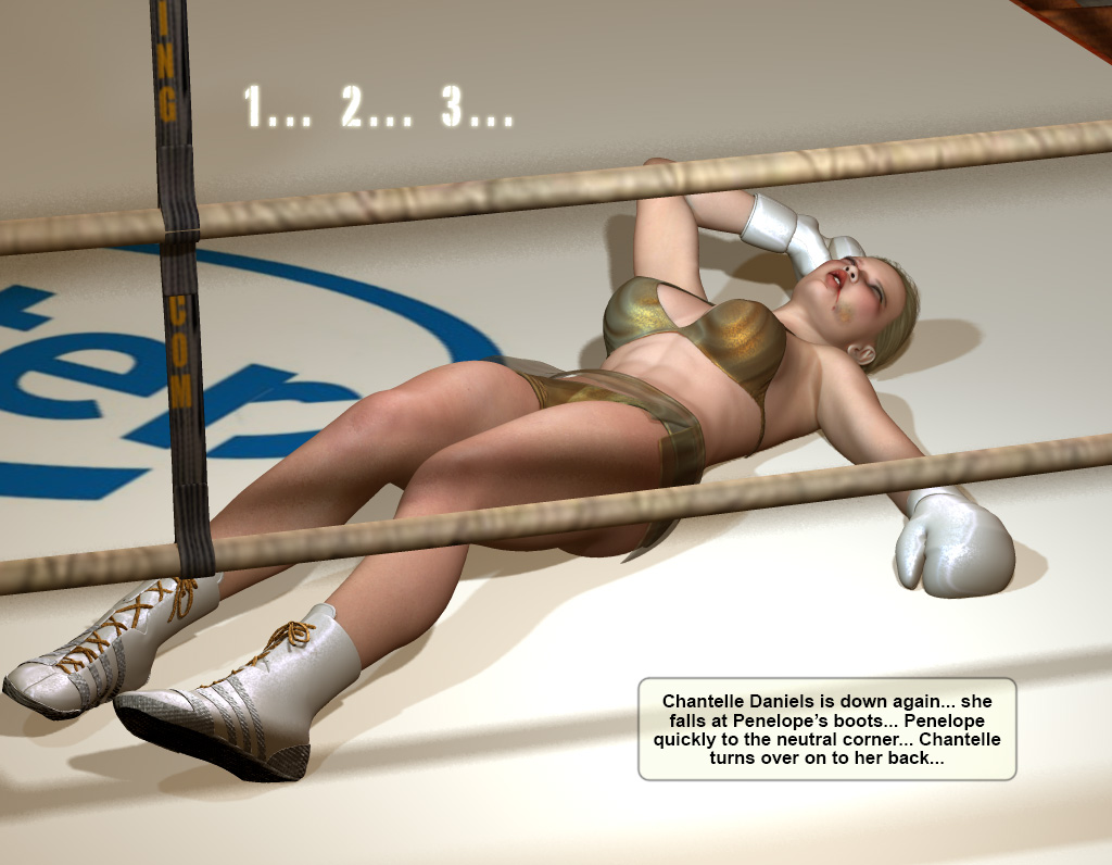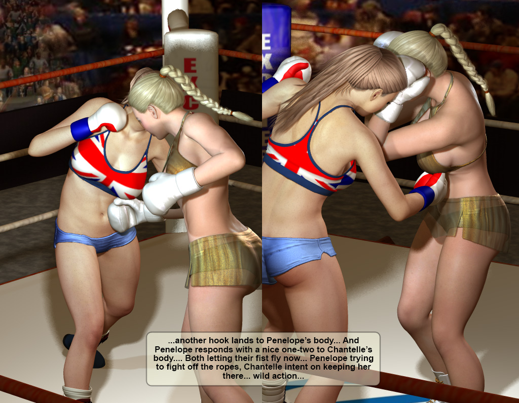 “Penelope looks over at Missy . . . she seems unsure . . . she closes in on Chantelle again, Chantelle’s arms are starting to sag . . . Penelope jabs forward with a right, and a left . . . Chantelle can’t protect herself . . . another left and Chantelle is back in the ropes . . . Chantelle ducks under them . . . the referee comes between the fighters . . . he works to untangle Chantelle . . .”