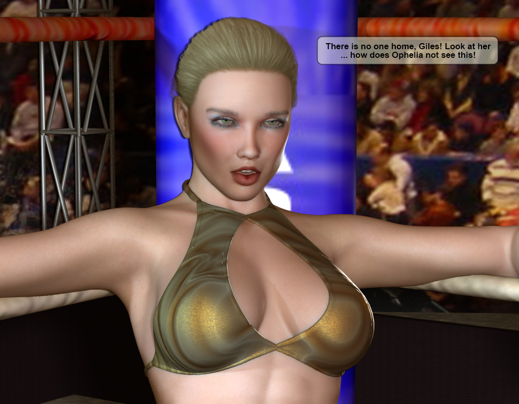 As Chantelle and Penelope stared each other down, Giles could see clearly that Chantella had about three inches on Penelope, and was the leaner of the two fighters. Penelope looked stronger than he could remember – Penelope had always been thin and wiry, but the new Penny had bulked up some, but was equally as taut as Chantelle. Chantelle was clad in her traditional gold top and gold sheer sheer mini skirt and low rise gold booty shorts – her traditional blond braid resting on her shoulder. The fight had finally come, and Giles was excited to call it – a strong, former champion was going to win and lose tonight -how it came out would be was anyone’s guess!