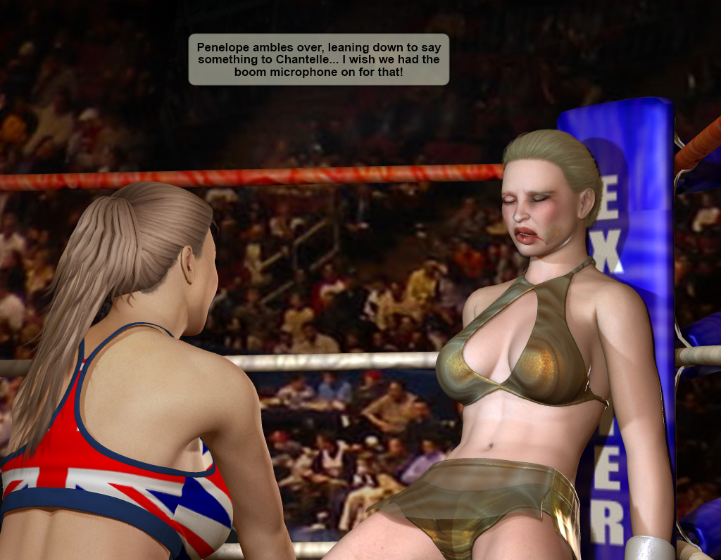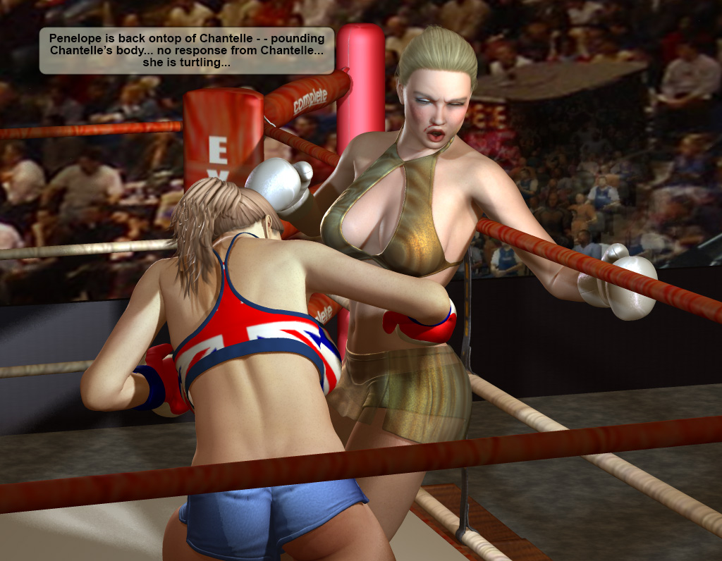 “Penelope lands another vicious right and Chantelle is back into the ropes . . . Penelope’s persues a staggering Chantelle . . .Chantelle firing away, trying to get off the ropes . . . Penelope absorbs those offering, walking through them . . . Penelope staggers her with another combination to the body . . . She has certainly pulverized Chantelle’s taut body with those sledgehammers you had mentioned!”