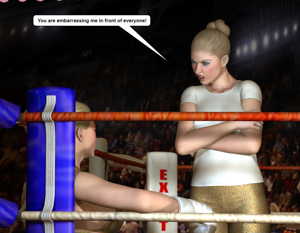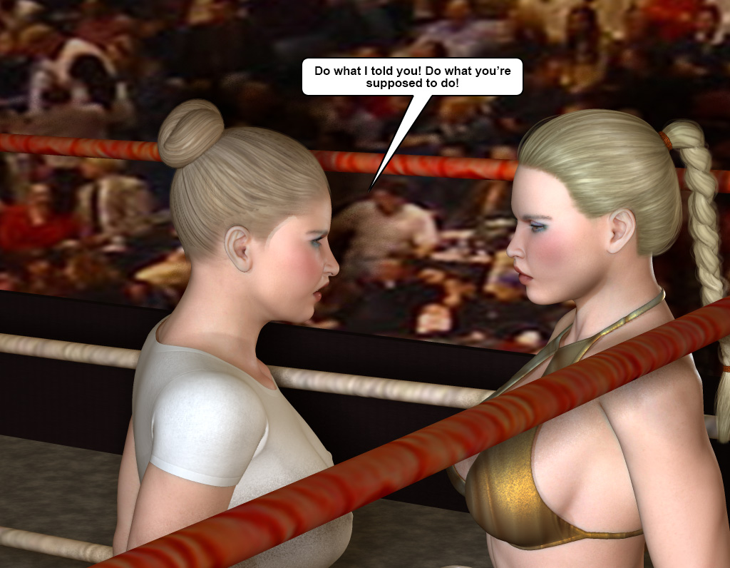 “ . . . Stay on her and finish it . . . if you have too . . .” They watched Missy turn to ringside where Johnson and the referee were huddled and shouted, “What are you doing Ty! Stop this thing! . . . Penny, be ready, this is going to the fifth . . . stay the course!”