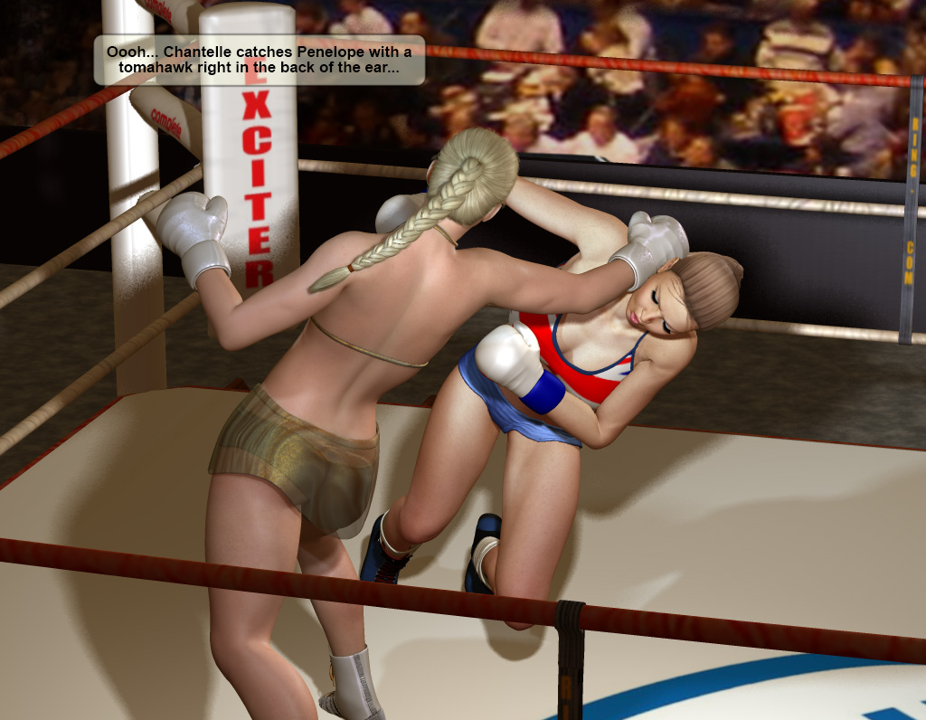 “And Chantelle fires an uppercut . . . it catches Penelope flush on the chin! Penelope staggers back a bit . . . that was the punch Chantelle was hoping to land . . .
