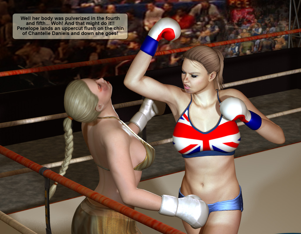 ‘Well her body was pulverized in the fourth and fifth . . . Woh! And that might do it!! Penelope lands an uppercut flush on the chin of Chantelle Daniels and down she goes!