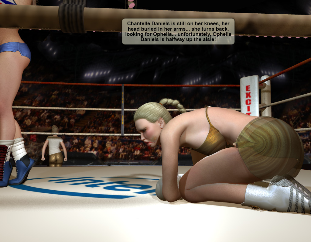 “Chantelle pushes herself off the canvas again . . . still unsteady . . she still hasn’t found her legs . . . the referee grabs her arms and yanks them with ease . . . Ophelia is yelling at the referee . . .”