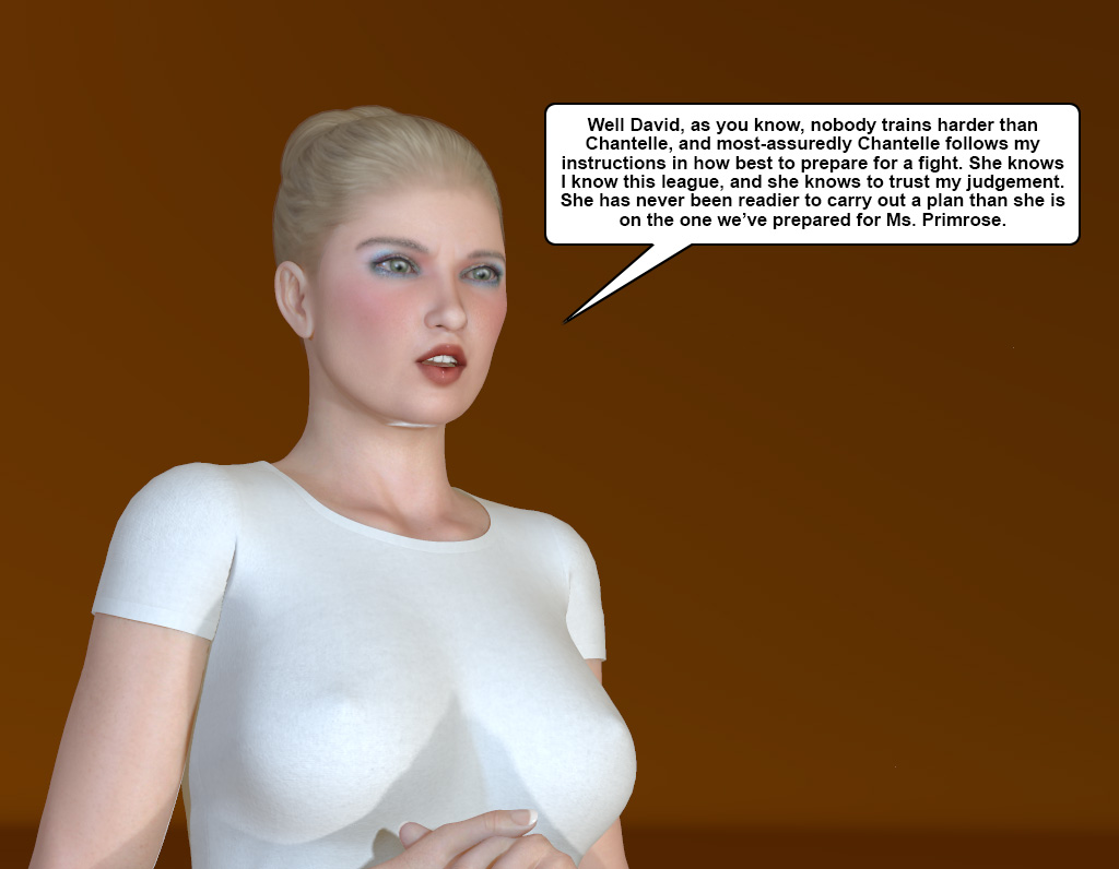“Well David, as you know, nobody trains harder than Chantelle, and most-assuredly Chantelle follows my instructions in how best to prepare for a fight. She knows I know this league, and she knows to trust my judgement. She has never been readier to carry out a plan than she is on the one we’ve prepared for Ms. Primrose.”