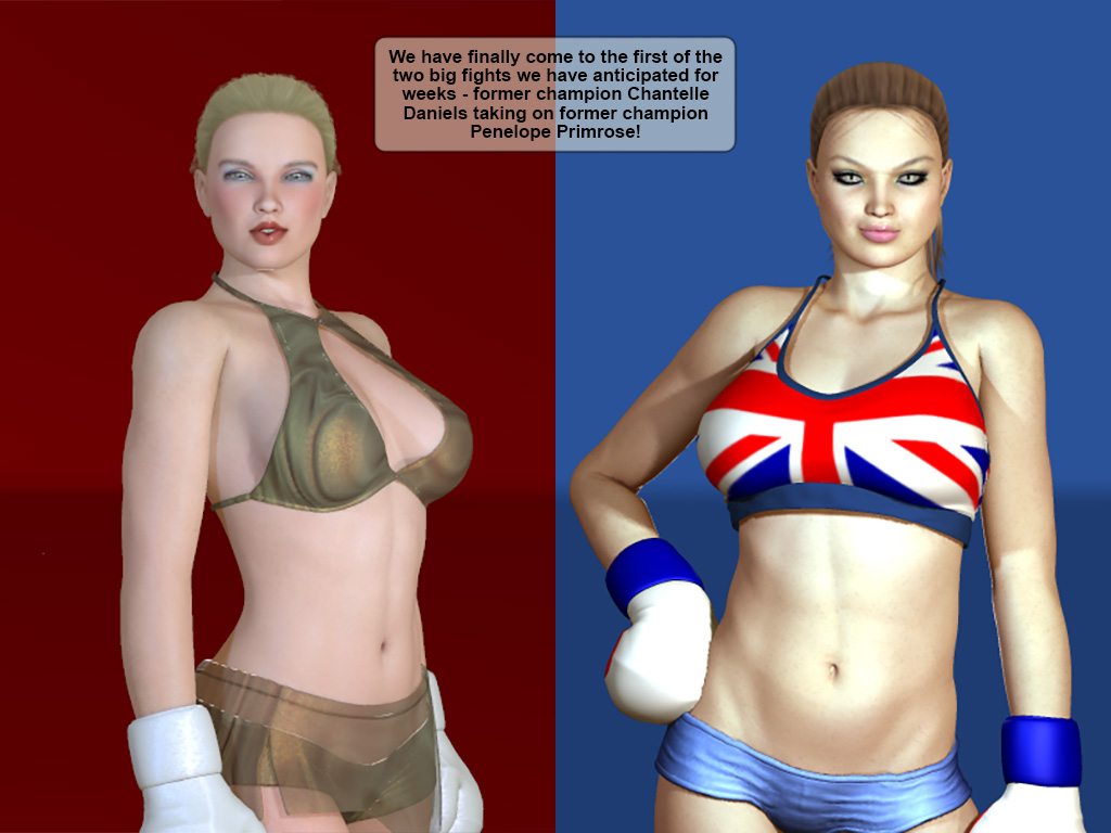 The camera’s cut back to David Kent, “There you have it, my brief sit down with the two trainers for tonight’s next bout. This is sure to be a dandy folks! Two former champions going at it! Chantelle Daniels trying to get back on her feet after losing her UK title to Morgan Mace, and Penelope Primrose trying to remind everyone that she still has championship form. It is time to send it back to our esteemed commentator Giles Watt, and his guest analyst for tonight Mairead MacGrath . . . Giles, take it away!”